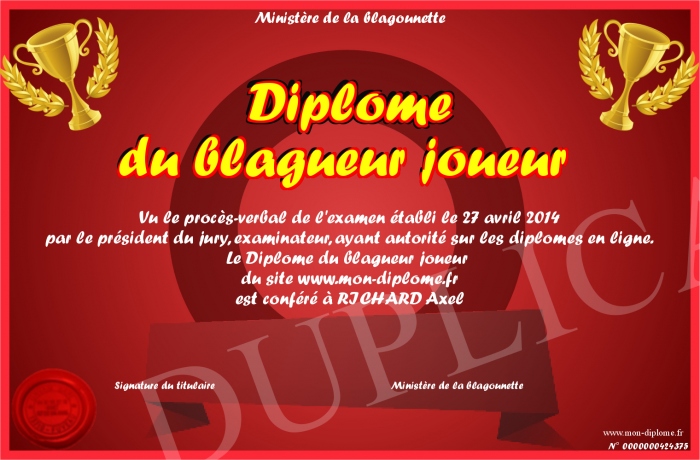 Envoyez par email votre Diplôme du blagueur joueur personalisé