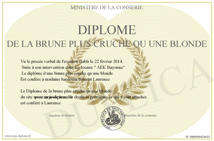 Envoyez par email votre Diplôme de la brune plus cruche qu une blonde personalisé