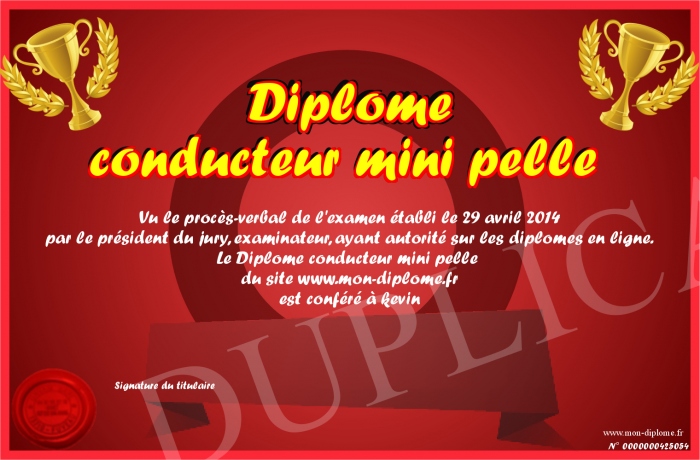 Envoyez par email votre Diplôme conducteur mini pelle personalisé