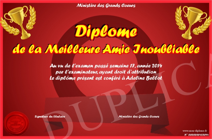 Envoyez par email votre Diplôme de la Meilleure Amie Inoubliable personalisé