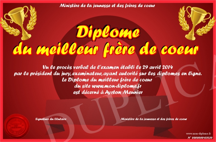 Envoyez par email votre Diplôme du meilleur frère de coeur personalisé