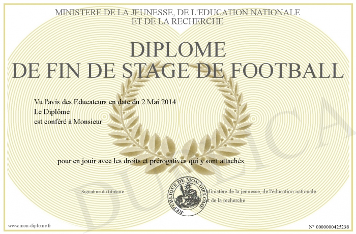 Envoyez par email votre Diplôme de fin de stage de football personalisé