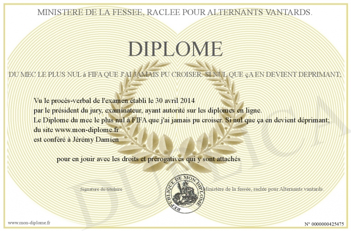 Envoyez par email votre Diplôme du mec le plus nul à FIFA que j'ai jamais pu croiser. Si nul que ça en devient déprimant; personalisé