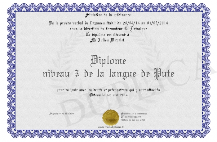 Envoyez par email votre Diplôme niveau 3 de la langue de Pute personalisé