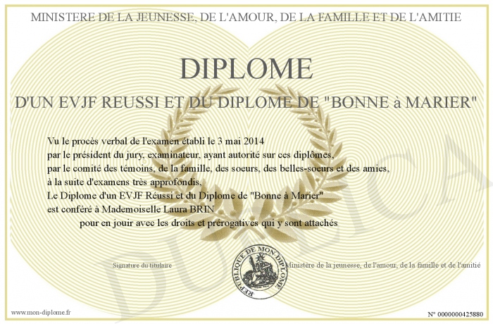 Envoyez par email votre Diplôme d'un EVJF Réussi et du Diplôme de -Bonne à Marier- personalisé