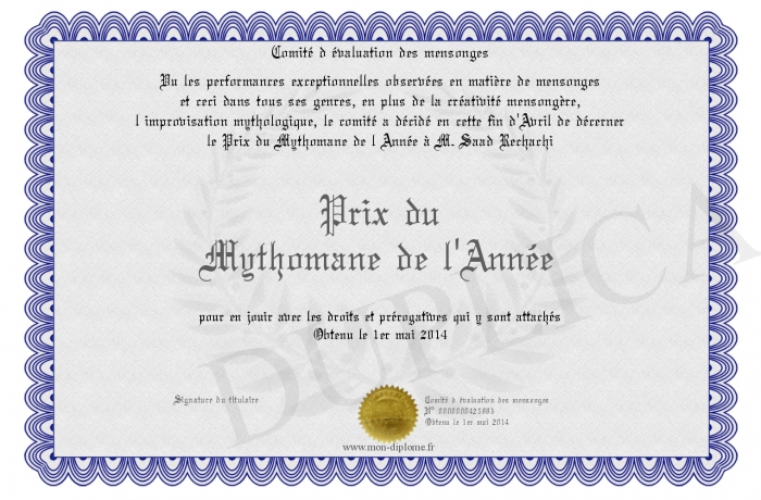 Envoyez par email votre Prix du Mythomane de l'Année personalisé