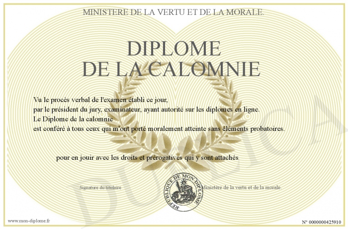 Envoyez par email votre Diplôme de la calomnie personalisé