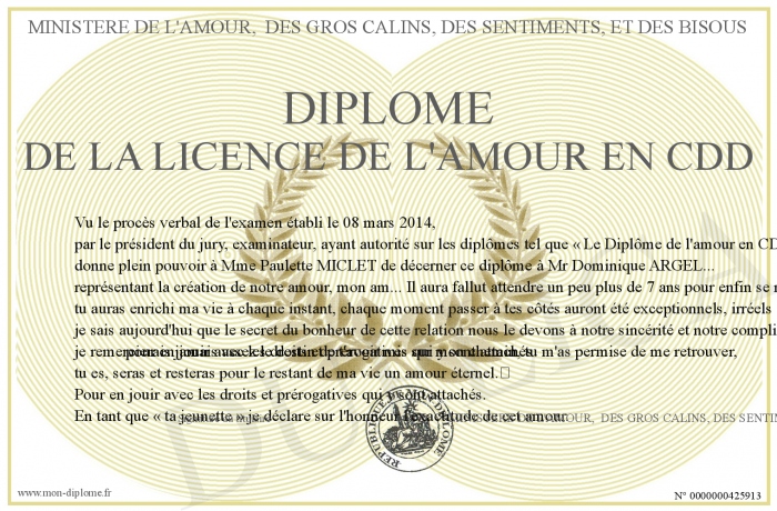 Envoyez par email votre DIPLOME DE LA LICENCE DE L'AMOUR EN CDD personalisé