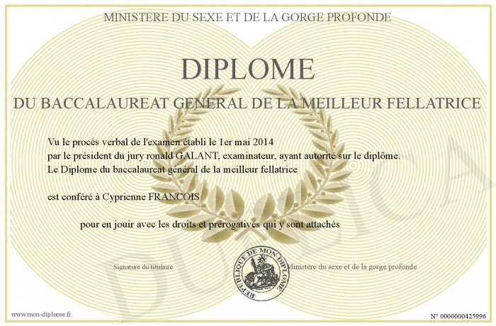 Envoyez par email votre Diplôme du baccalaureat général de la meilleur fellatrice personalisé