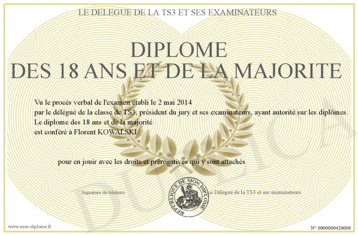 Envoyez par email votre diplôme des 18 ans et de la majorité personalisé