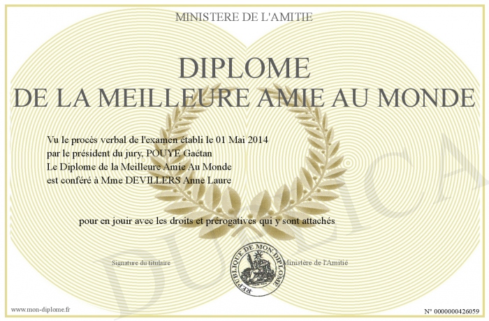 Envoyez par email votre Diplôme de la Meilleure Amie Au Monde personalisé