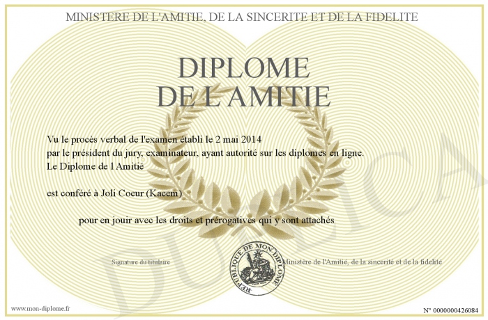 Envoyez par email votre Diplôme de l Amitié personalisé