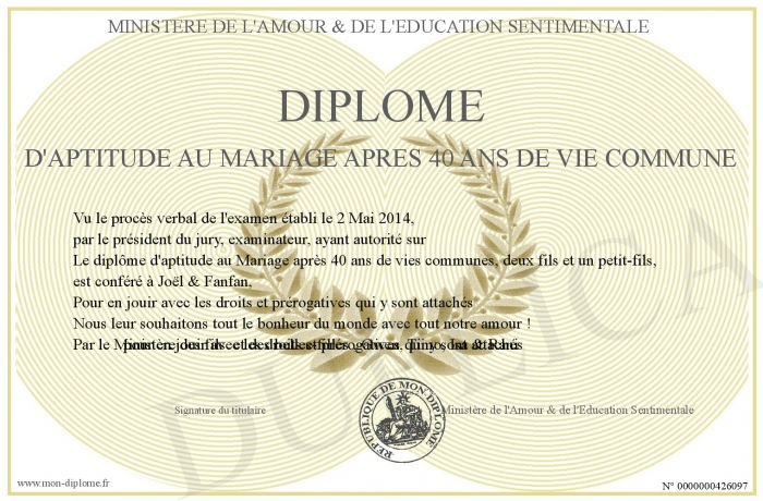 Envoyez par email votre Diplôme d'Aptitude au Mariage après 40 ans de vie commune personalisé