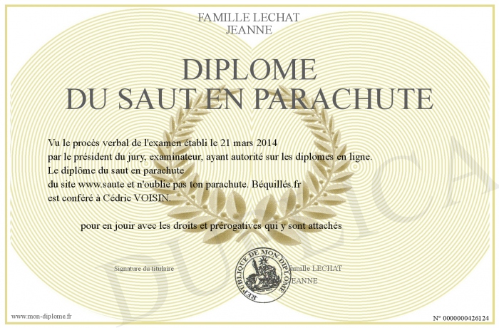 Envoyez par email votre Diplôme du saut en parachute personalisé