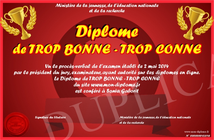 Envoyez par email votre Diplôme de TROP BONNE - TROP CONNE personalisé