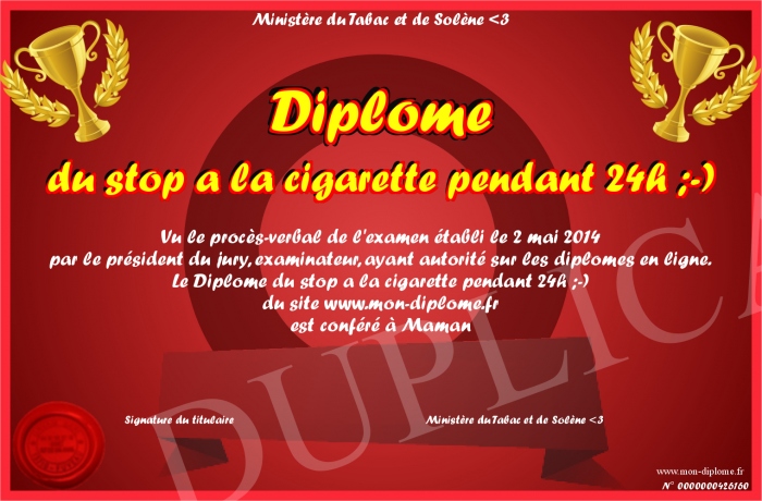 Envoyez par email votre Diplôme du stop a la cigarette pendant 24h ;-) personalisé