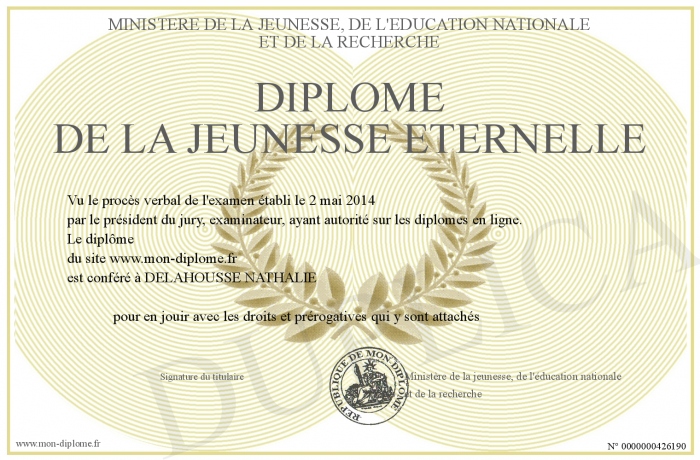 Envoyez par email votre Diplôme de la jeunesse eternelle personalisé