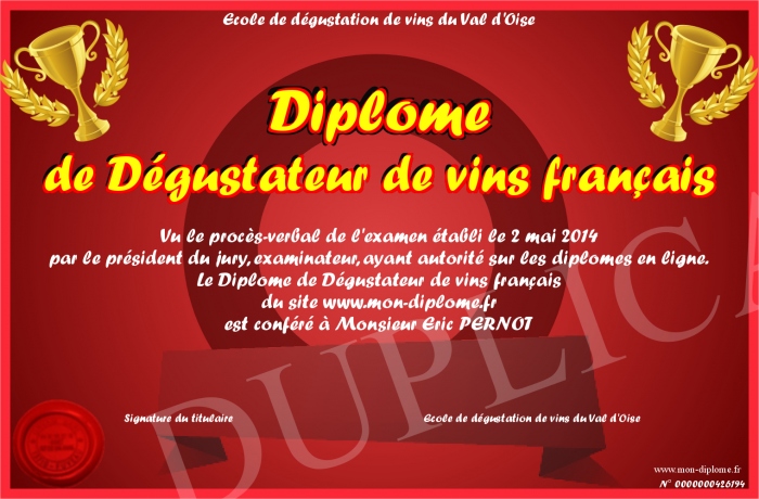 Envoyez par email votre Diplôme de Dégustateur de vins français personalisé