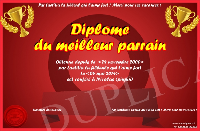 Envoyez par email votre Diplôme du meilleur parrain personalisé