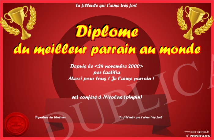 Envoyez par email votre Diplôme du meilleur parrain au monde personalisé