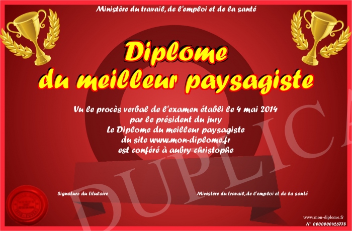 Envoyez par email votre Diplome du meilleur paysagiste personalisé