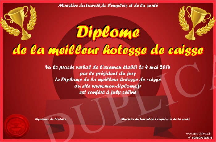 Envoyez par email votre Diplôme de la meilleur hotesse de caisse personalisé