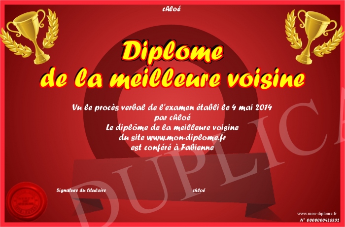 Envoyez par email votre Diplôme de la meilleure voisine personalisé
