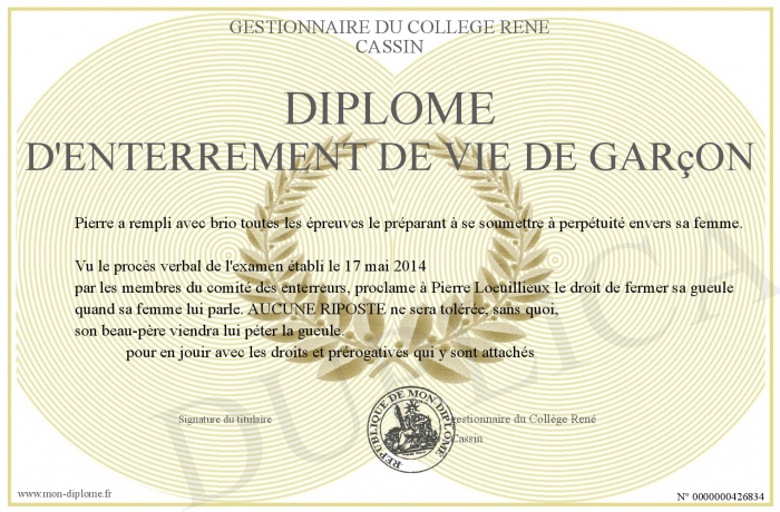 Envoyez par email votre diplôme d'enterrement de vie de garçon personalisé