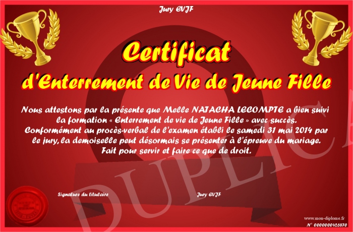 Envoyez par email votre Certificat d'Enterrement de Vie de Jeune Fille personalisé
