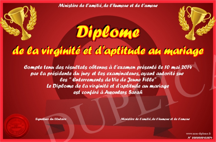 Envoyez par email votre Diplôme de la virginité et d'aptitude au mariage personalisé