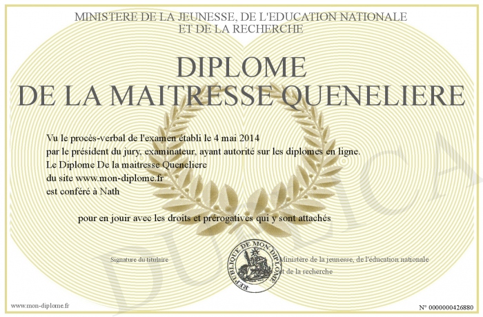 Envoyez par email votre Diplôme De la maitresse Queneliere personalisé