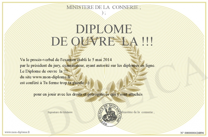 Envoyez par email votre Diplôme de ouvre la !!! personalisé