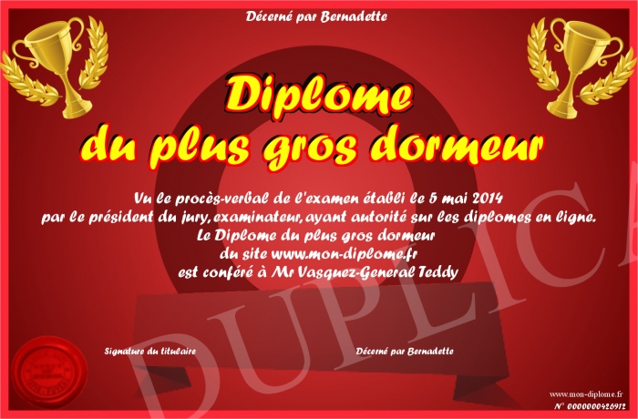 Envoyez par email votre Diplôme du plus gros dormeur personalisé