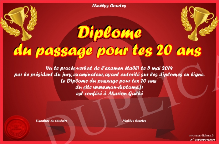 Envoyez par email votre Diplôme du passage pour tes 20 ans personalisé