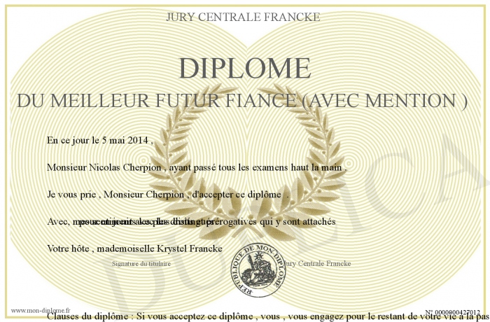 Envoyez par email votre Diplôme du meilleur Futur Fiancé (avec mention ) personalisé