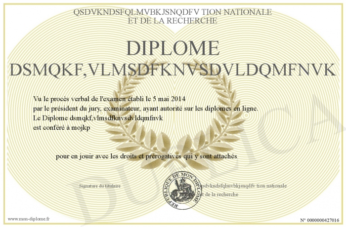 Envoyez par email votre Diplôme dsmqkf,vlmsdfknvsdvldqmfnvk personalisé
