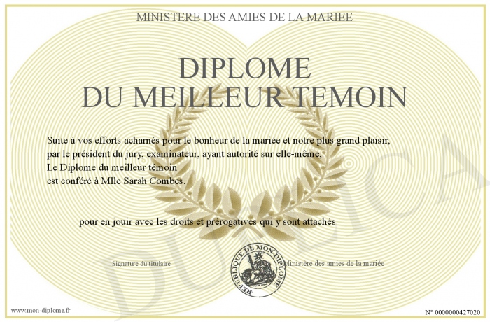Envoyez par email votre Diplôme du meilleur témoin personalisé