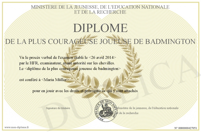 Envoyez par email votre Diplôme de la plus courageuse joueuse de badmington personalisé