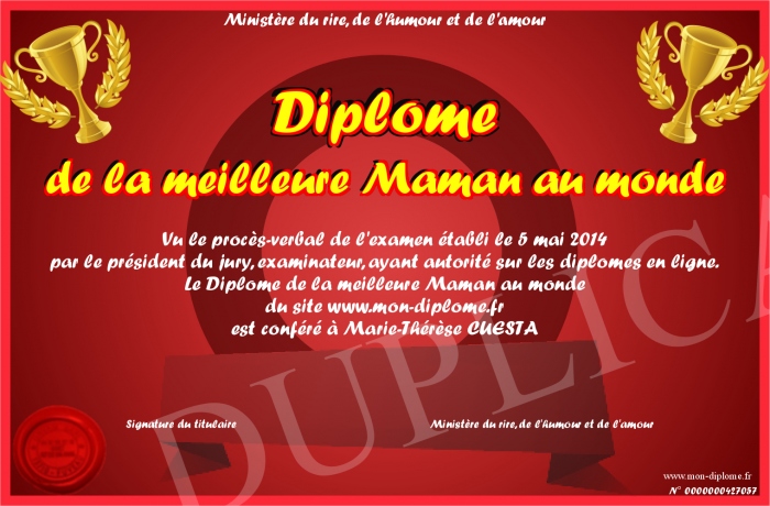 Envoyez par email votre Diplome de la meilleure Maman au monde personalisé