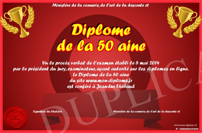 Envoyez par email votre Diplôme de la 50 aine personalisé