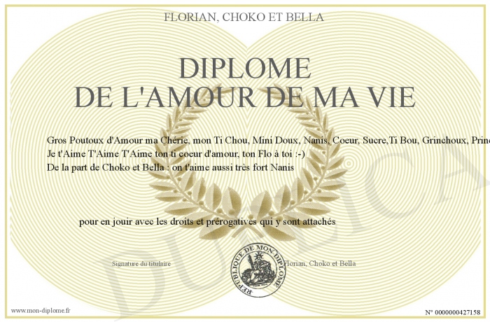 Envoyez par email votre Diplôme de l'Amour de ma Vie personalisé