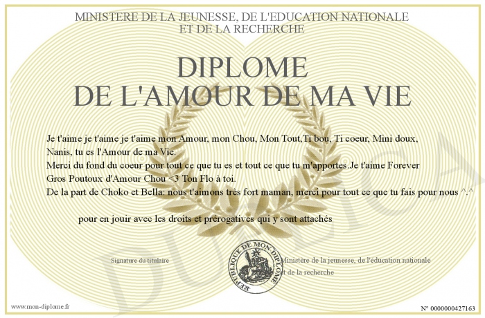 Envoyez par email votre Diplôme de l'Amour de ma Vie personalisé