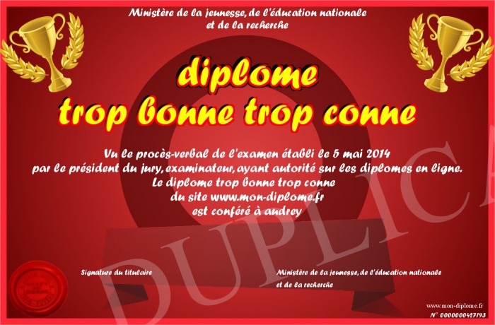 Envoyez par email votre diplome trop bonne trop conne personalisé