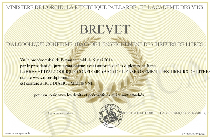 Envoyez par email votre BREVET D'ALCOOLIQUE CONFIRME (BAC) DE L'ENSEIGNEMENT DES TIREURS DE LITRES personalisé