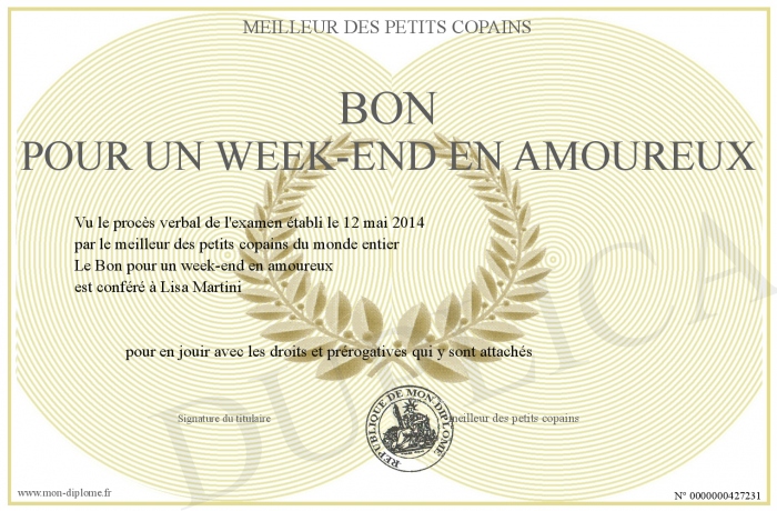 Envoyez par email votre Bon pour un week-end en amoureux personalisé