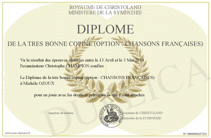 Envoyez par email votre Diplôme de la trés bonne copine (option : CHANSONS FRANÇAISES) personalisé