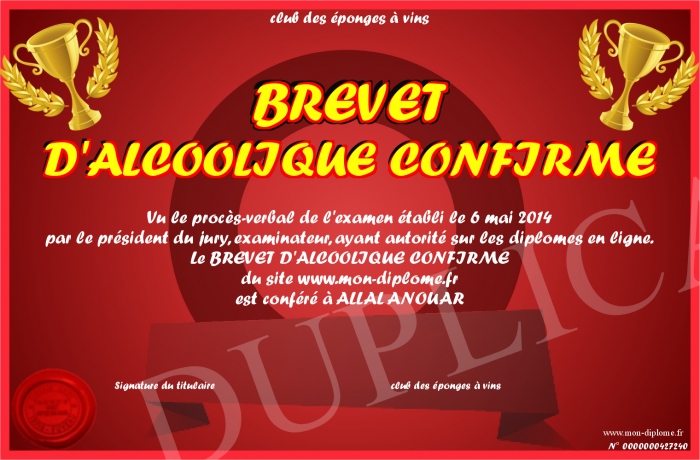 Envoyez par email votre BREVET D'ALCOOLIQUE CONFIRME personalisé