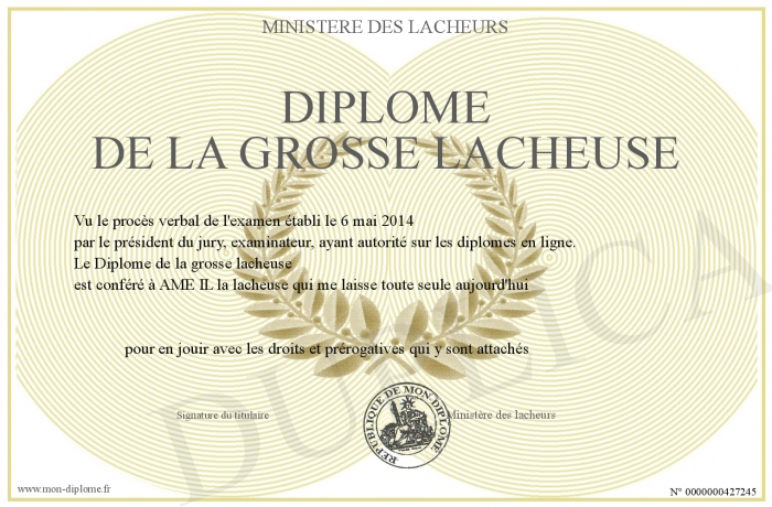 Envoyez par email votre Diplôme de la grosse lacheuse personalisé