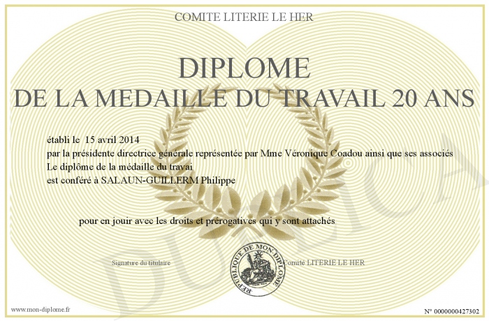 Envoyez par email votre Diplôme de la médaille du travail 20 ans personalisé