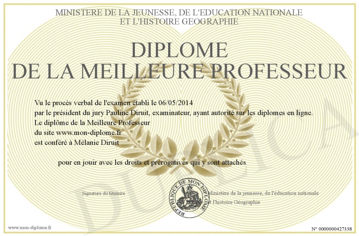 Envoyez par email votre Diplôme de la Meilleure Professeur personalisé